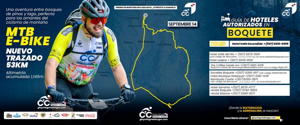 Consulta la imagen a continuación para conocer los hoteles disponibles, sus tarifas especiales y números de contacto para hospedarte durante el Gran Fondo Cycling Challenge Reto Boquete. ¡Aprovecha estas opciones exclusivas para participantes!